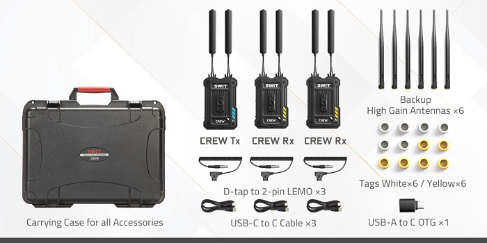 CREW 無線設備提供 1Tx + 2Rx 套裝,包含所有必需配件,並配有便攜包,方便存放和攜帶。